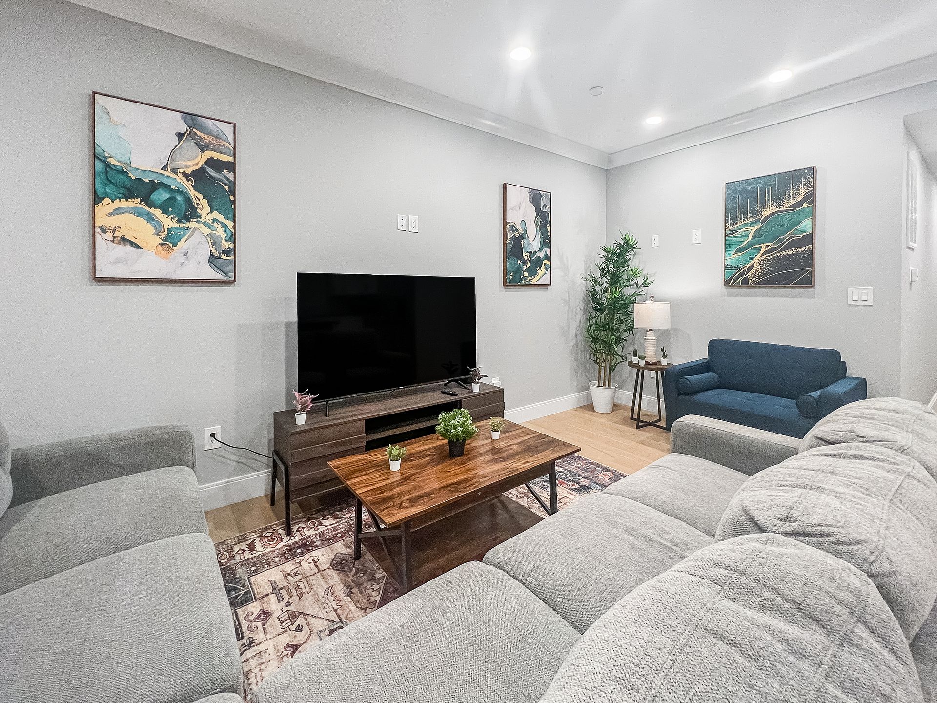- Three bedrooms, two bathrooms, living room, and fully-equipped kitchen.